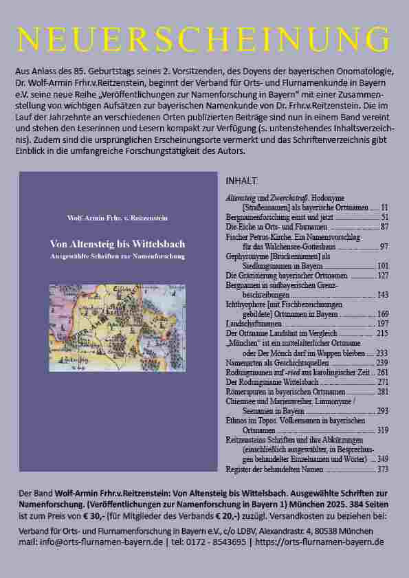 Aus Anlass des 85. Geburtstags seines 2. Vorsitzenden, des Doyens der bayerischen Onomatologie, Dr. Wolf-Armin Frhr.v.Reitzenstein, beginnt der Verband für Orts- und Flurnamenkunde in Bayern e.V. seine neue Reihe „Veröffentlichungen zur Namenforschung in Bayern“ mit einer Zusammen-stellung von wichtigen Aufsätzen zur bayerischen Namenkunde von Dr. Frhr.v.Reitzenstein. Die im Lauf der Jahrzehnte an verschiedenen Orten publizierten Beiträge sind nun in einem Band vereint und stehen den Leserinnen und Lesern kompakt zur Verfügung (s. untenstehendes Inhaltsverzeichnis). Zudem sind die ursprünglichen Erscheinungsorte vermerkt und das Schriftenverzeichnis gibt Einblick in die umfangreiche Forschungstätigkeit des Autors Wolf-Armin Frhr. v.
